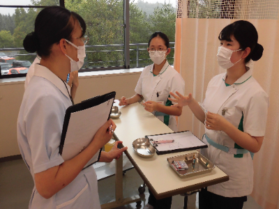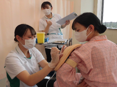 初めての注射の演習です。緊張しましたが、正確に安全に実施できる様に頑張っています。